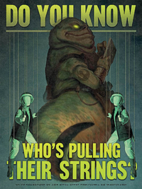 Through several techniques, propaganda tended to imply connections between two separate things, whether they were true or not. Examples of such techniques were readily found in the Office of Imperial Promotion, Galactic Truth, and Fact Correction, which sought to counter the influence of the New Republic during the last days of the Galactic Empire. Who's Pulling the Strings?, an Imperial poster that depicted two New Republic soldiers in the foreground, with a Hutt in the background, insinuated a connection between the New Republic and organized crime syndicates such as the Hutt Clan.[1] Likewise, a poster of dirty, ill-kept New Republic troops with flamethrowers burning down an Imperial Academy with screaming children in the windows, implied that the New Republic had no morality, and were no better than drunken thugs.[2]